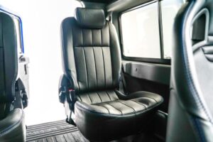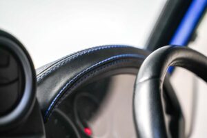 インテリアは、フロントは左右共にRECARO CS Sportsシート。フロントシート、リアシート共にプレミアムレザーにて本革張替。ステッチはボディカラーに合わせて”ブルー”のステッチがあしらわれています。