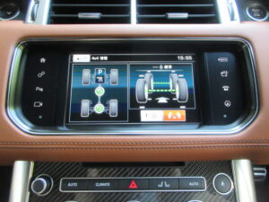 インテリアトリムは、人気の“カーボンファイバートリム”。シフトゲートの横には2本分の大きなドリンクホルダー。シフトゲートの周りには、テレインレスポンス、EPB、エアサスペンション、EPB、HDC、アクティブエキゾーストのスイッチ類等が用意されております。